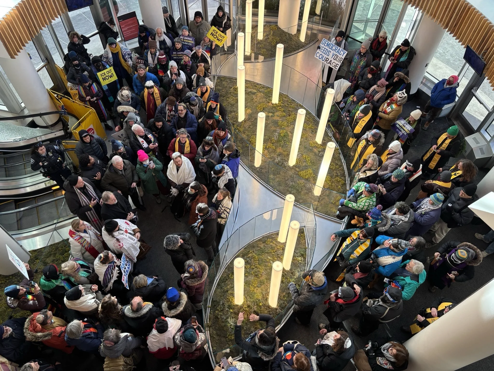 The second was at the Target HQ downtown where hundreds of us stood in unified song and oratory in the rotunda foyer, as Target officials and police listened to the eloquent call of ministers and rabbis on begging corporations like Target to stand with the people, the shoppers, the citizens of Minneapolis and the nation right now, rather than bow to the trumped-up charges of this administration's immigration roundups.