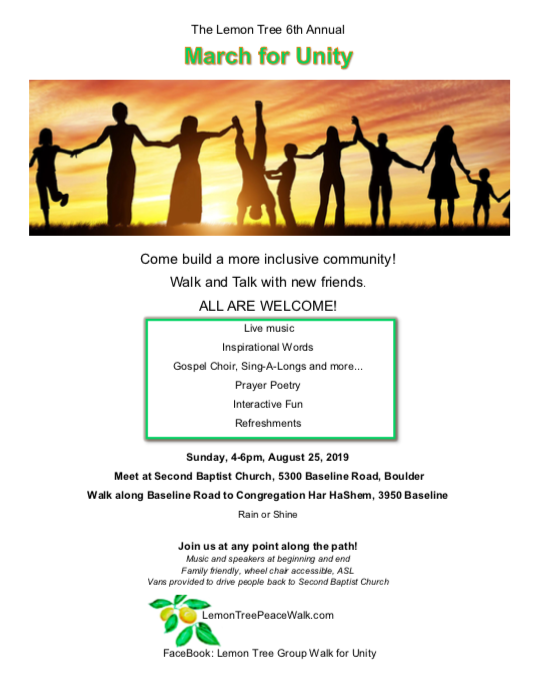 The Lemon Tree Group’s March for Unity brings together people from different communities and backgrounds who do not usually meet, talk, and listen to one another. Walkers are encouraged to get to know each other in an effort to transcend differences through understanding. Rabbi Tirzah will speak at this march and has coordinated a diverse line-up of speakers including Congresspeople, clergy, and community leaders. All are welcome!